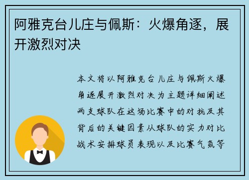 本文将以“阿雅克台儿庄与佩斯:火爆角逐,展开激烈对决”为主题,详细阐述两支球队在这场比赛中的对抗及其背后的关键因素。从球队的实力对比、战术安排、球员表现以及比赛气氛等方面进行全面分析,探讨阿雅克台儿庄和佩斯之间的激烈对决是如何发展成一场充满张力的比赛的。在每个方面,本文将通过多个自然段详细展开,为读者呈现一场富有戏剧性的体育赛事如何影响比赛结果的全景视角。
